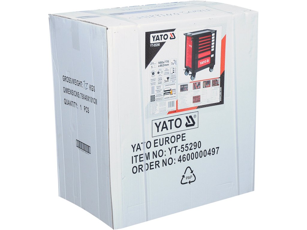 Dílenská skříňka nástrojů značky YATO, vybavena 7 zásuvkami s kuličkovým ložiskem, 5 horních zásuvek obsahuje 211 pečlivě vybraných nástrojů.