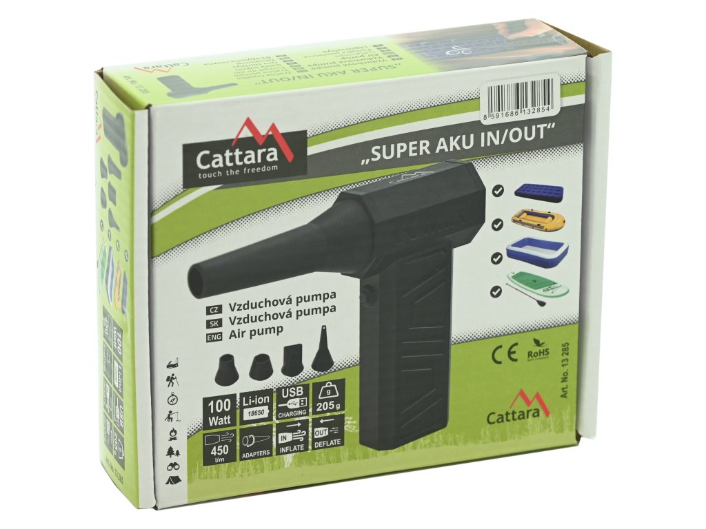Vzduchová pumpa Cattara SUPER AKU IN/OUT je kompaktní bezdrátové univerzální zařízení určené pro nafukování a vyfukování předmětů.